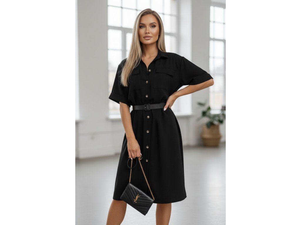 Elegantní a nadčasové dámské košilové šaty s páskem, které jsou ideální volbou pro každodenní nošení i elegantnější příležitosti. Díky volnějšímu střihu a pásku v pase krásně zvýrazní siluetu a přizpůsobí se postavě.