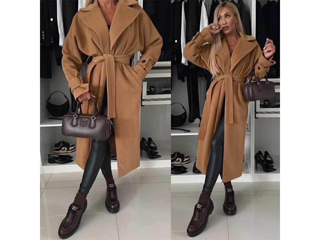 Objevte nadčasovou eleganci s tímto dámským dlouhým kabátem s páskem. Stylový střih s hlubokým límcem a zavazovacím páskem krásně zvýrazní postavu a dodá celému outfitu ženský šmrnc. Ideální volba pro podzim a zimu, kdy chcete vypadat chic a zároveň se cítit pohodlně.
