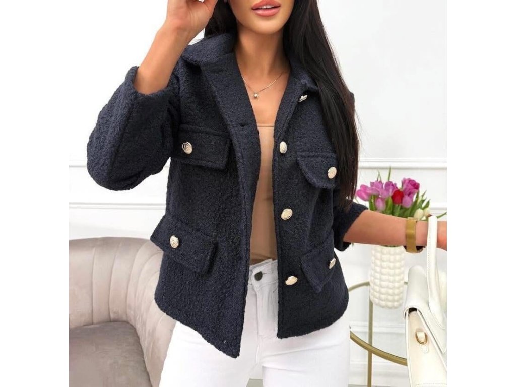 Buďte vždy chic s tímto dámským krátkým kabátkem s ozdobnými knoflíky. Stylový kousek, který v sobě spojuje eleganci a pohodlí. Kratší střih je ideální k džínám i elegantním kalhotám, zatímco výrazné zlaté knoflíky dodávají outfitu luxusní šmrnc.