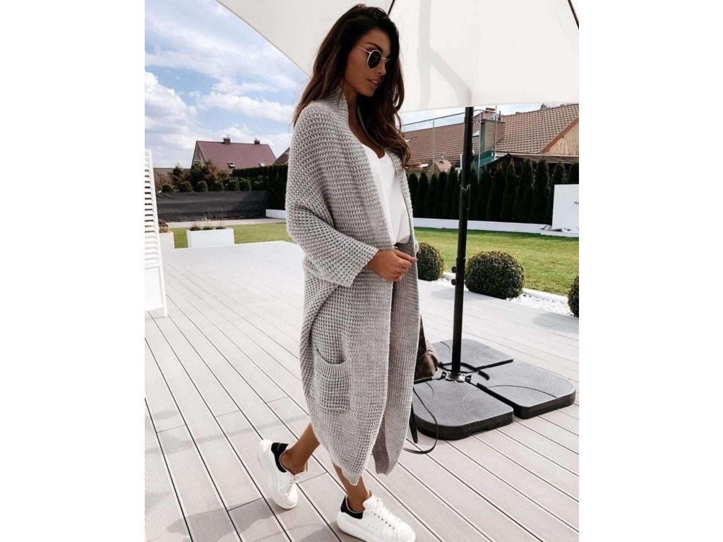 Stylový, měkoučký a ideální na každodenní nošení! Tento dlouhý pletený kardigan v jemné šedé barvě je perfektní volbou pro chladnější letní večery, podzimní procházky i pohodové dny doma.